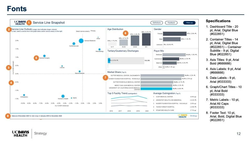 Additionally, I was instrumental in establishing design standards across the larger organization at bothUC Davis Health and Sutter Health. This encompasses the development of analytic dashboard templates, presentation templates, slide layouts, guidelines, and training materials utilized across each health system.